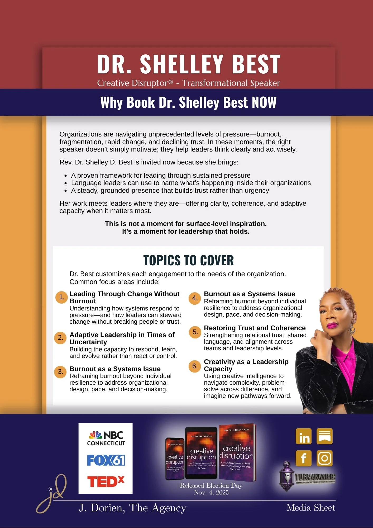 Rev. Dr. Shelley D. Best is a nationally respected spiritual leader, cultural strategist, and the visionary behind the Creative Disruptor® Framework—her signature approach to rebuilding communities through the power of art, imagination, and justice.