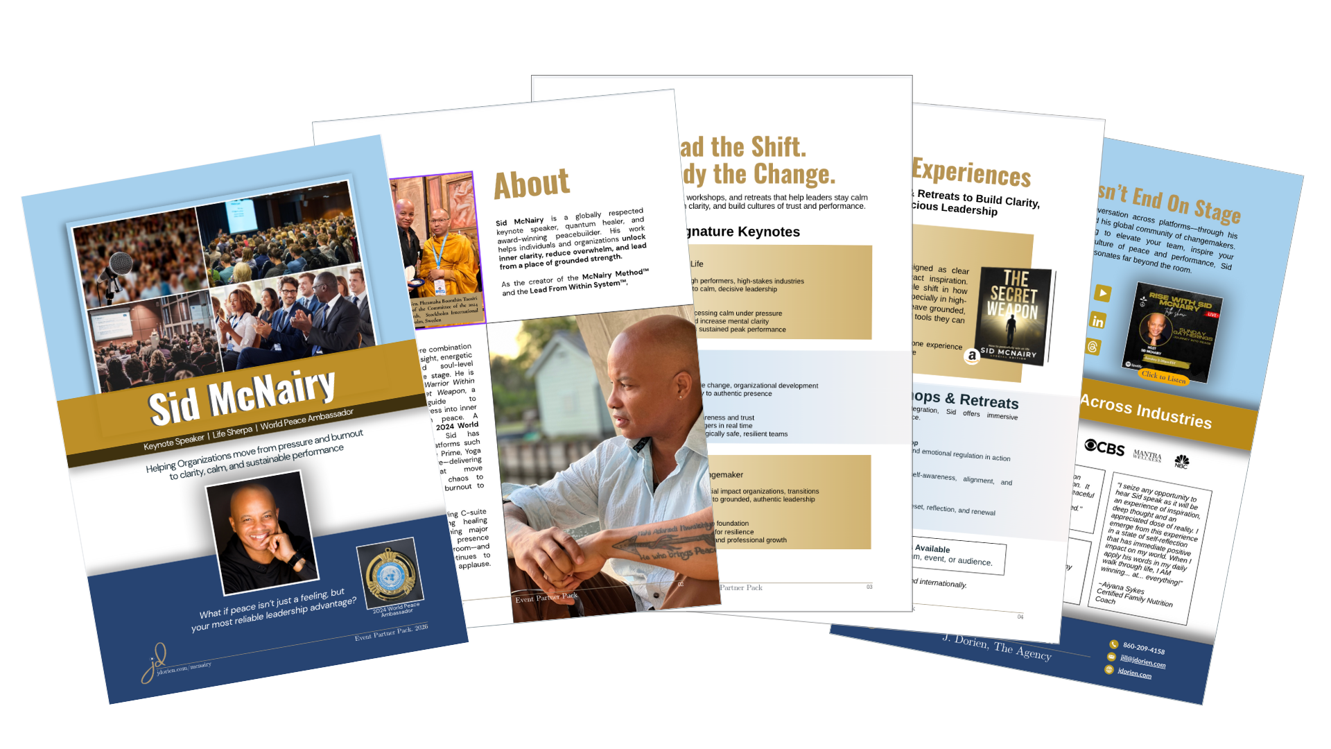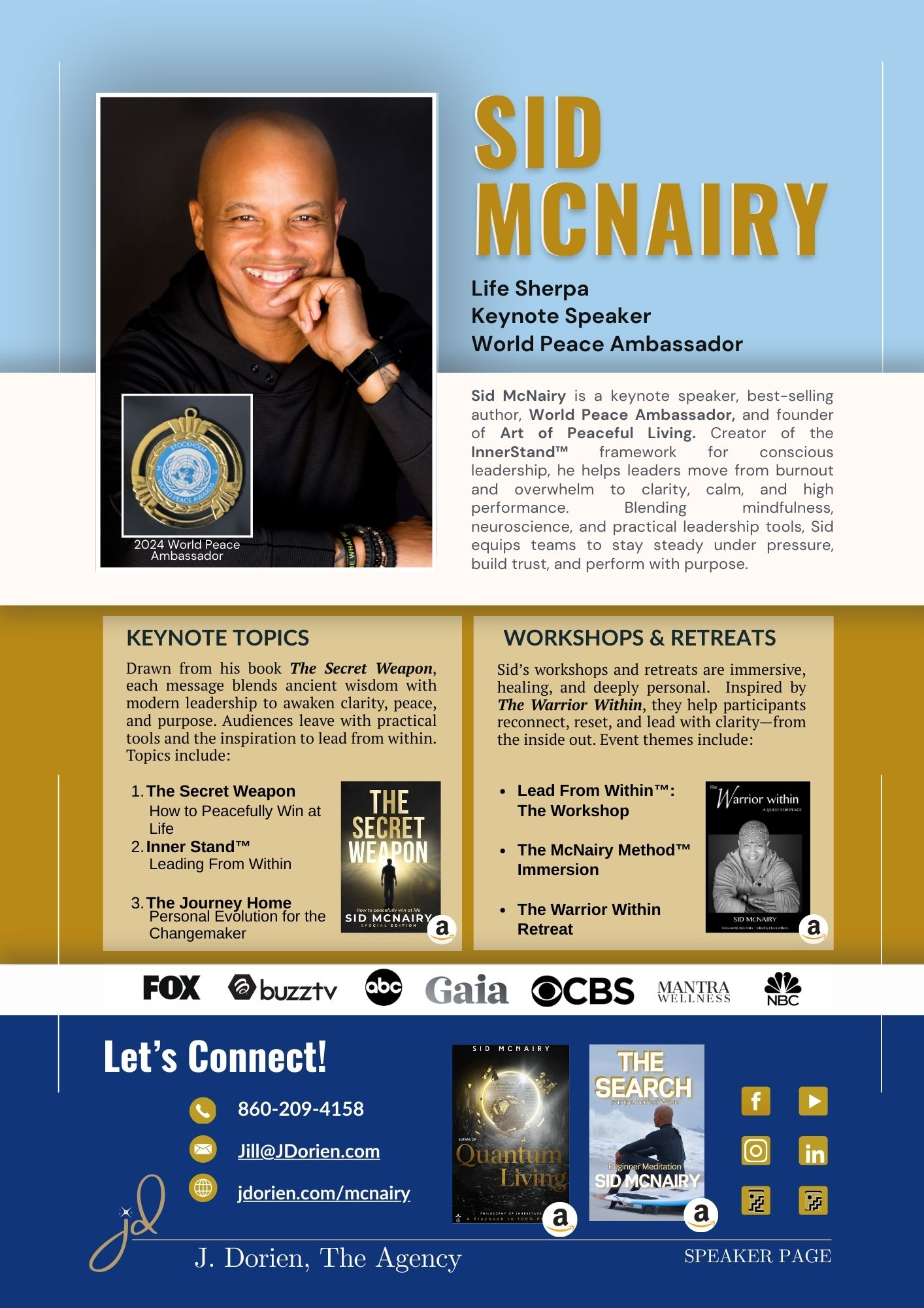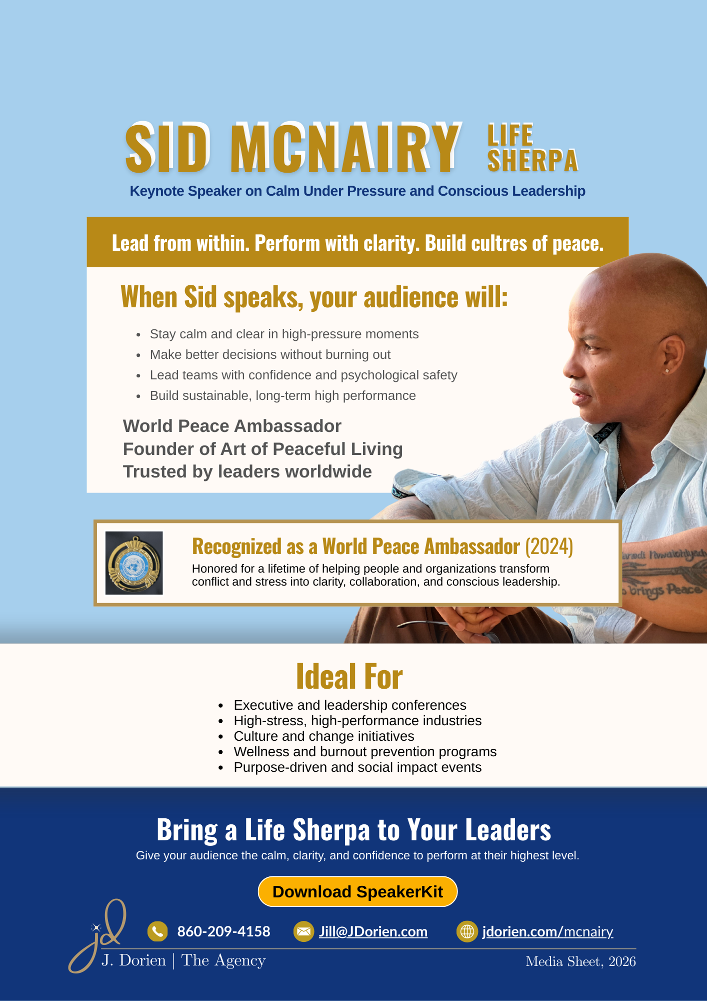 In recognition of his lifelong commitment to healing and harmony, Sid was named a World Peace Ambassador in 2024. This honor reflects what audiences consistently experience in his keynotes and workshops: a calm, centered presence that helps people reconnect with their best thinking and lead with clarity and compassion.